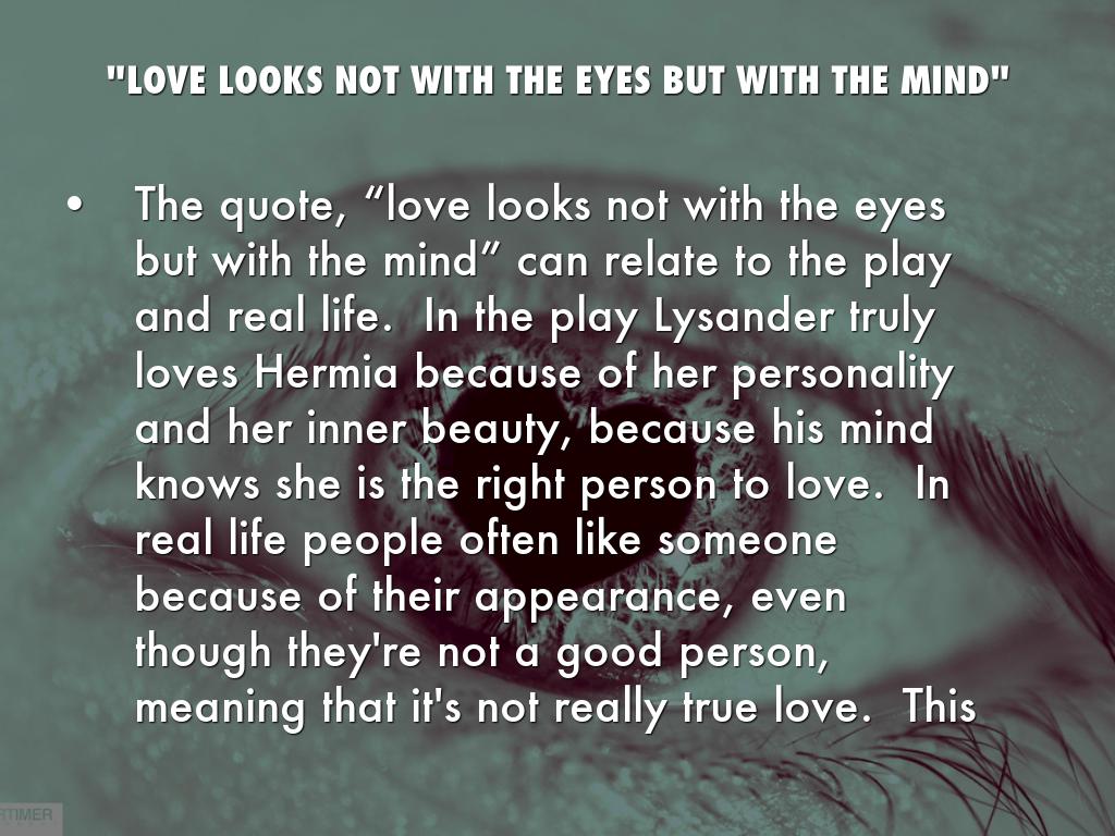 The quote, “love looks not with the eyes but with the mind” can relate to the play and real life. In the play Lysander truly loves Hermia because of her personality and her inner beauty, because his mind knows she is the right person to love. In real life people often like someone because of their appearance, even though they're not a good person, meaning that it's not really true love. This quote states that true love is liking someone for who they are as a person, not just because they're attractive. When a person likes someone else for how exceptional of a person they are and all of their aspects, then it truly is true love. In AMSND, Demetrius didn't love Hermia for who she really was. Helena was Demetrius’s true love because she had an extreme passion and desire for him. So, as you can see from real-world and AMSND examples true love comes from the mind and heart, not from appearance.