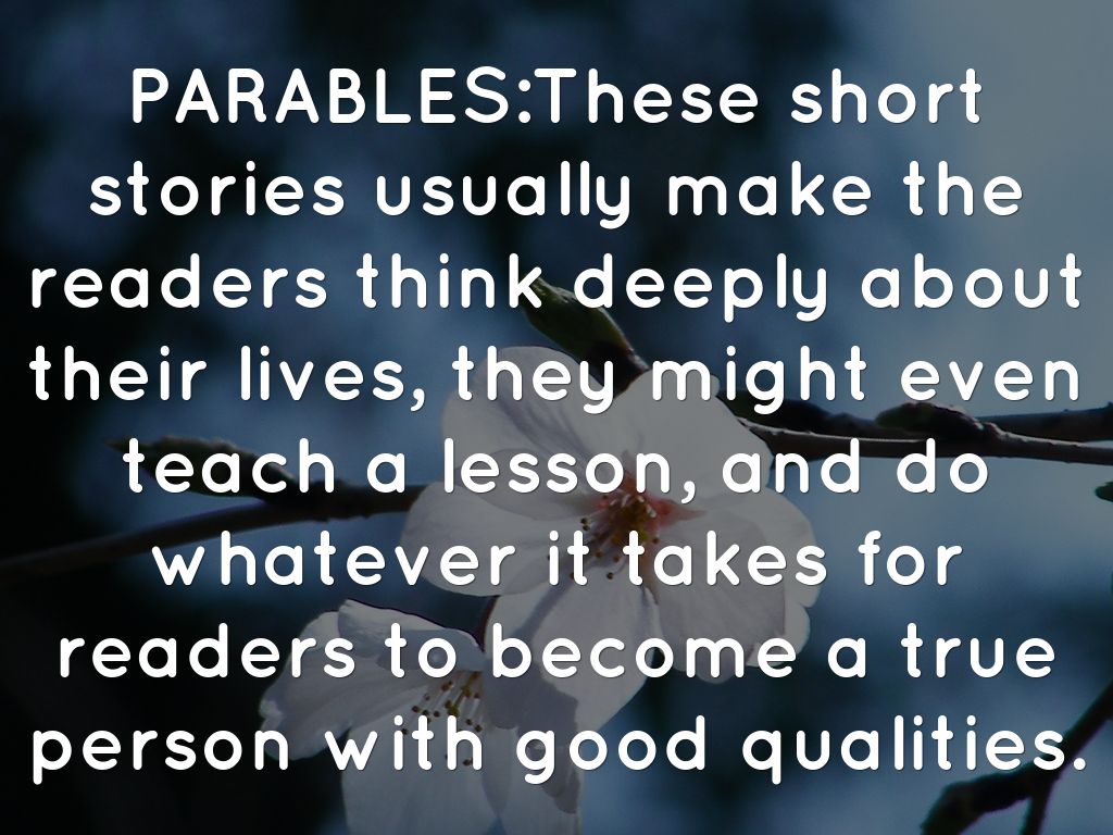 PARABLES:These short stories usually make the readers think deeply about their lives, they might even teach a lesson, and do whatever it takes for readers to become a true person with good qualities.