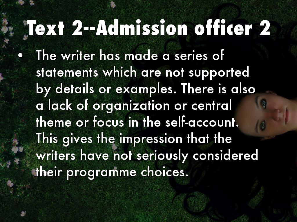 The writer has made a series of statements which are not supported by details or examples. There is also a lack of organization or central theme or focus in the self-account. This gives the impression that the writers have not seriously considered their programme choices.