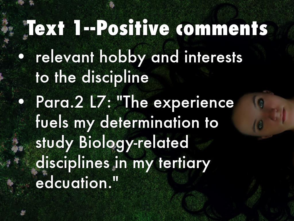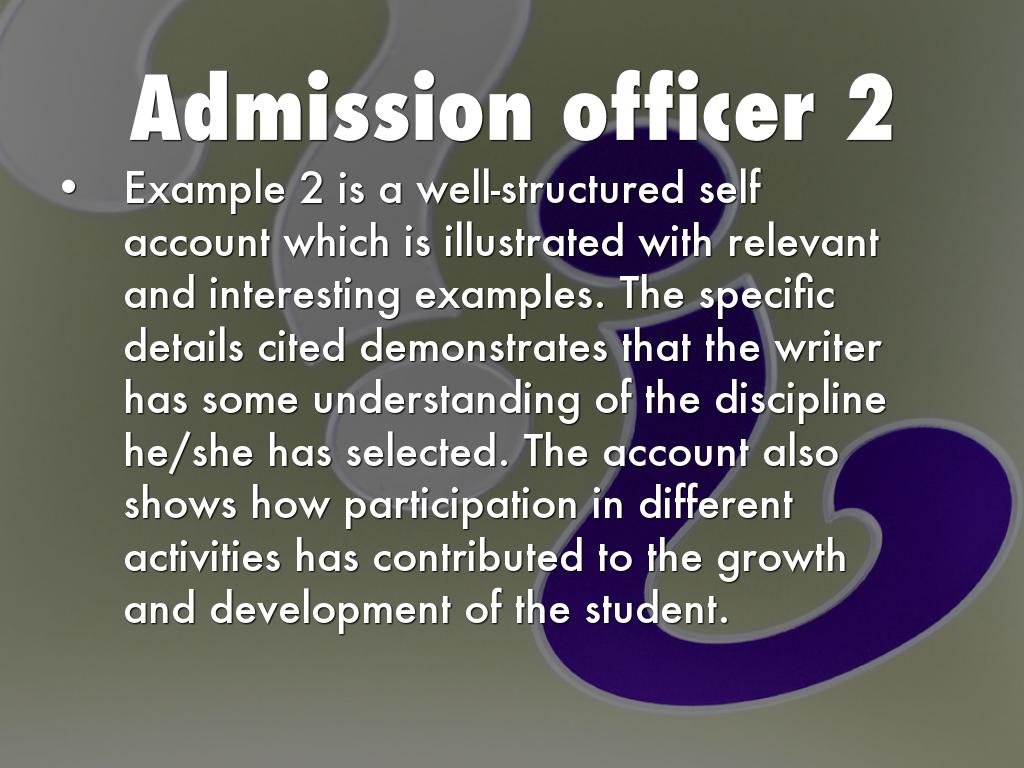 Example 2 is a well-structured self account which is illustrated with relevant and interesting examples. The specific details cited demonstrates that the writer has some understanding of the discipline he/she has selected. The account also shows how participation in different activities has contributed to the growth and development of the student.