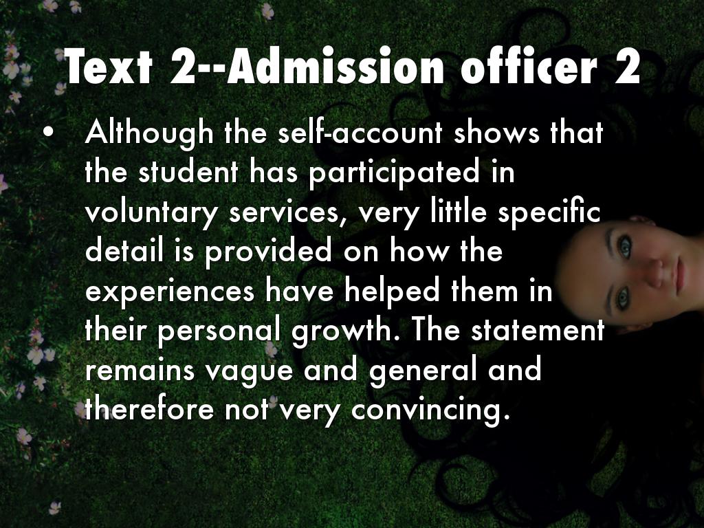 Although the self-account shows that the student has participated in voluntary services, very little specific detail is provided on how the experiences have helped them in their personal growth. The statement remains vague and general and therefore not very convincing.