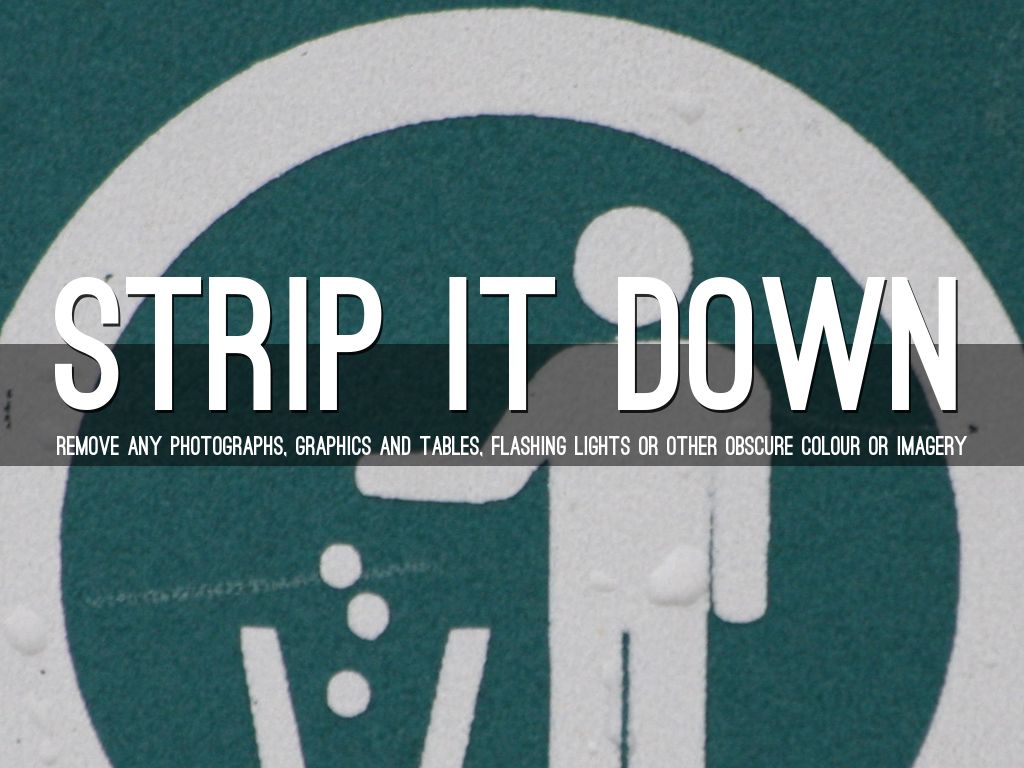 Remove any photographs, graphics and tables, flashing lights or other obscure colour or imagery