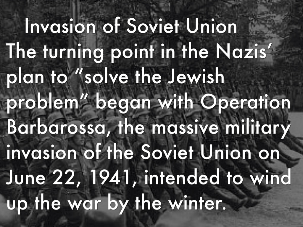 The turning point in the Nazis’ plan to “solve the Jewish problem” began with Operation Barbarossa, the massive military invasion of the Soviet Union on June 22, 1941, intended to wind up the war by the winter.