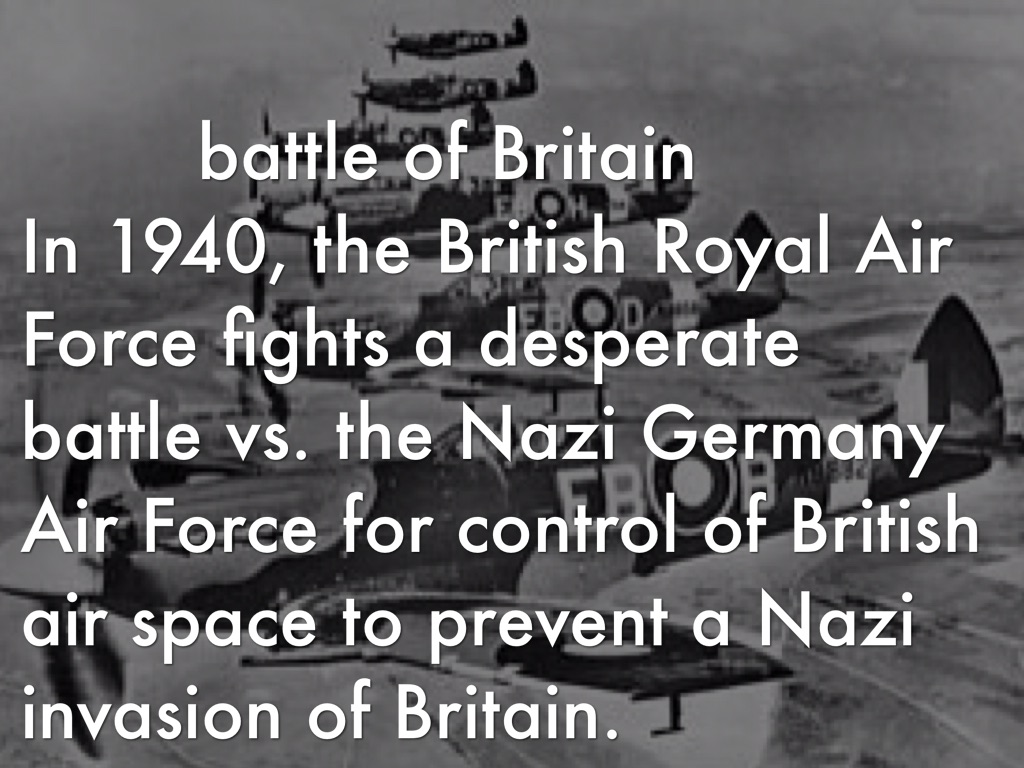 In 1940, the British Royal Air Force fights a desperate battle vs. the Nazi Germany Air Force for control of British air space to prevent a Nazi invasion of Britain.