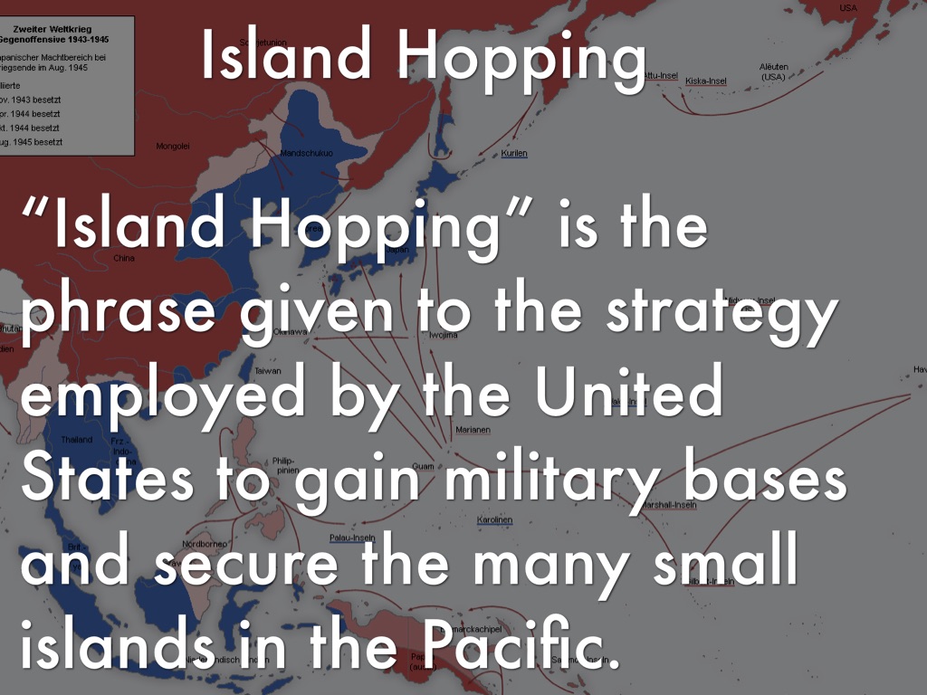 “Island Hopping” is the phrase given to the strategy employed by the United States to gain military bases and secure the many small islands in the Pacific.