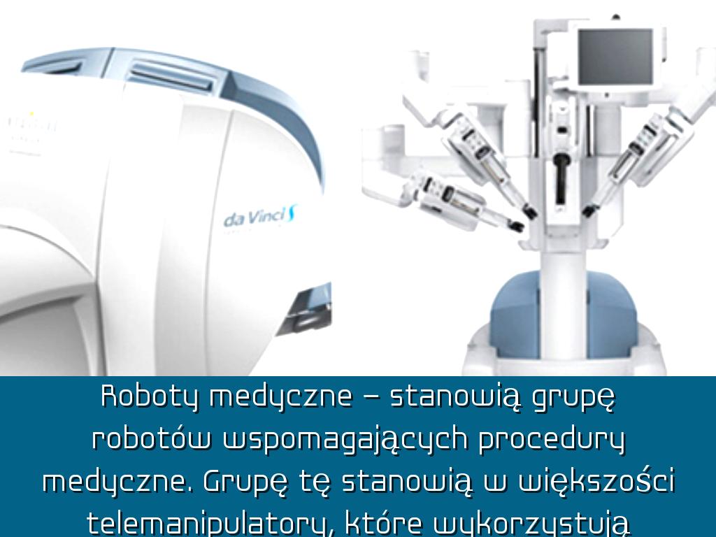 Roboty medyczne – stanowią grupę robotów wspomagających procedury medyczne. Grupę tę stanowią w większości telemanipulatory, które wykorzystują działanie lekarza po jednej stronie i efektora po drugiej stronie. Zadaniem lekarza jest sterowanie ruchami robota oraz decydowanie o zadaniach do wykonania. Efektor z kolei, jak wynika z nazwy, ma za zadanie wykonywanie zadanych mu poleceń z nieosiągalną dla człowieka precyzją.