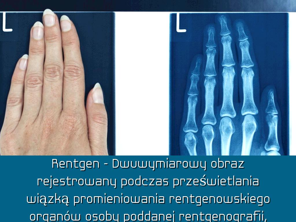 Rentgen - Dwuwymiarowy obraz rejestrowany podczas prześwietlania wiązką promieniowania rentgenowskiego organów osoby poddanej rentgenografii, która jest jedną z podstawowych technik diagnostycznych w medycynie. Badania rentgenowskie nie są obojętne dla zdrowia, ponieważ około 99% promieniowania jest pochłaniane przez organizm.