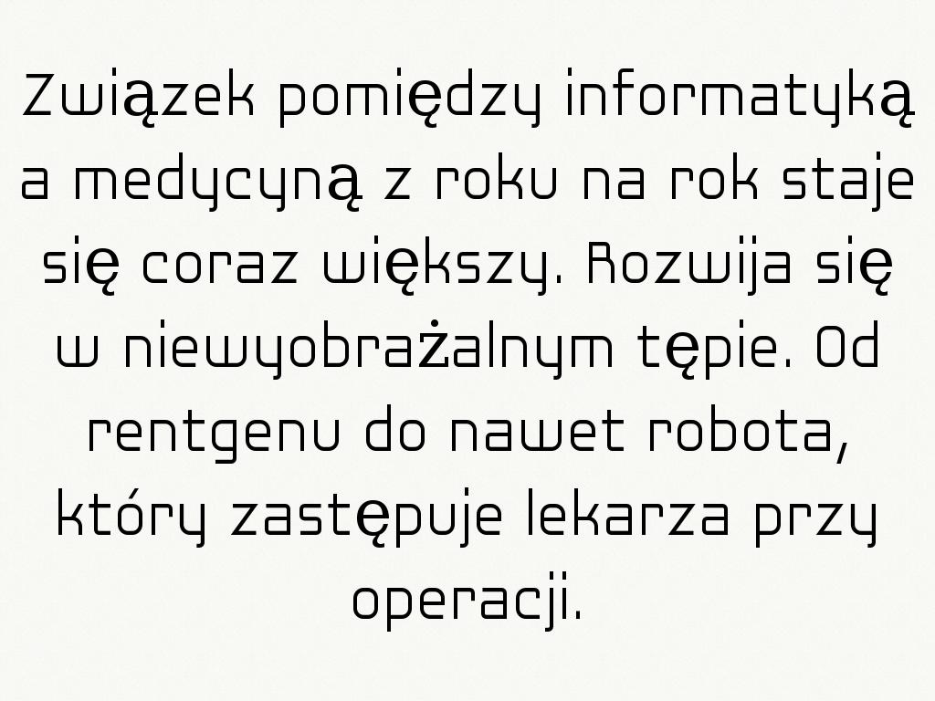 Związek pomiędzy informatyką a medycyną z roku na rok staje się coraz większy. Rozwija się w niewyobrażalnym tępie. Od rentgenu do nawet robota, który zastępuje lekarza przy operacji.