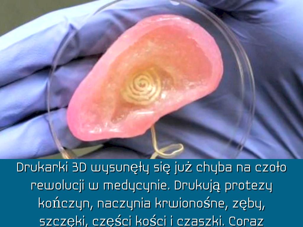 Drukarki 3D wysunęły się już chyba na czoło rewolucji w medycynie. Drukują protezy kończyn, naczynia krwionośne, zęby, szczęki, części kości i czaszki. Coraz częściej słyszymy o eksperymentach z drukowaniem tkanek z żywych komórek.