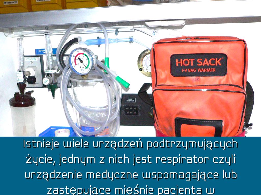 Istnieje wiele urządzeń podtrzymujących życie, jednym z nich jest respirator czyli urządzenie medyczne wspomagające lub zastępujące mięśnie pacjenta w wykonywaniu pracy oddechowej. Maszyna umożliwia sztuczne, wymuszone oddychanie, wykorzystywane w sytuacjach ustania czynności oddechowej, bądź celem jej ułatwienia.