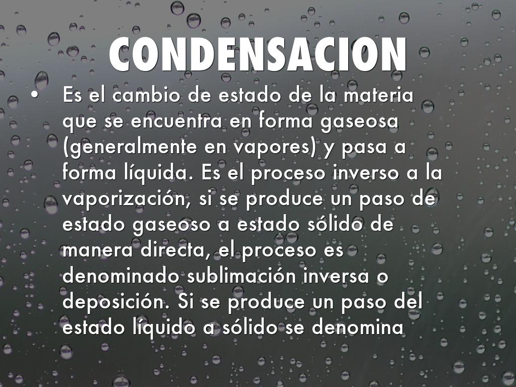• Es el cambio de estado de la materia que se encuentra en forma gaseosa (generalmente en vapores) y pasa a forma líquida. Es el proceso inverso a la vaporización, si se produce un paso de estado gaseoso a estado sólido de manera directa, el proceso es denominado sublimación inversa o deposición. Si se produce un paso del estado líquido a sólido se denomina solidificación.