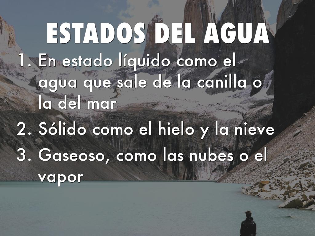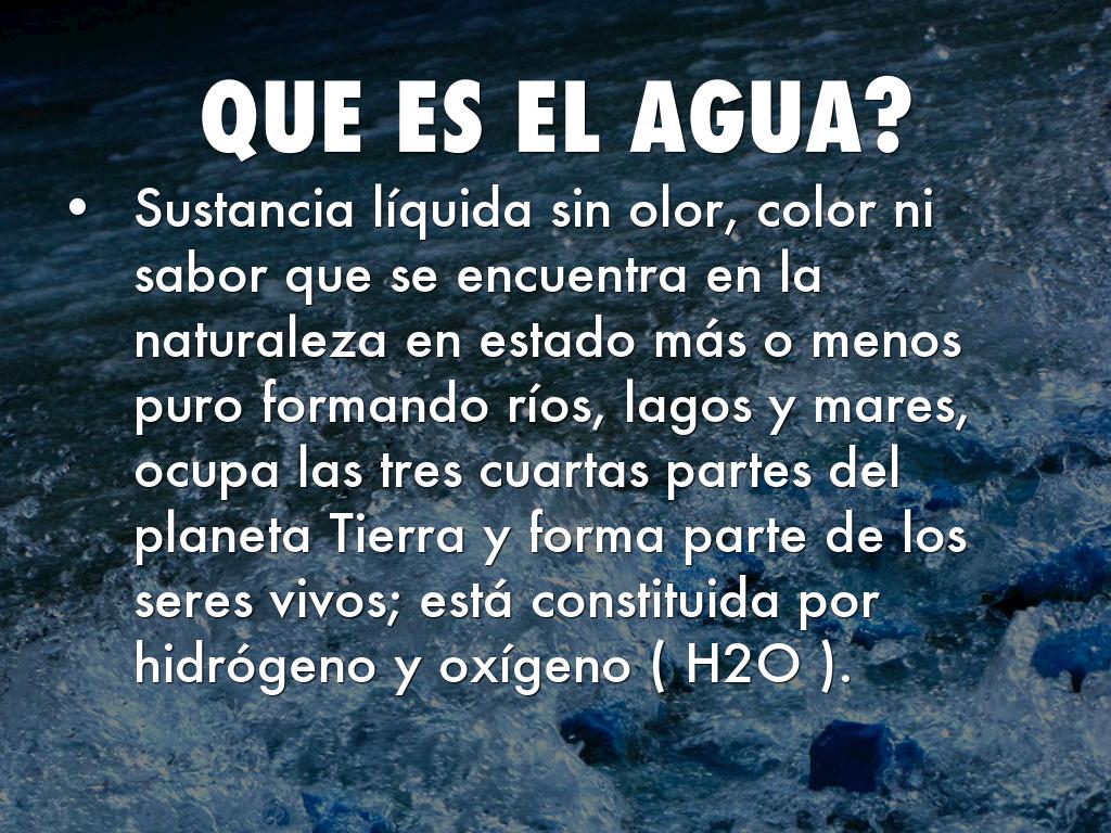 • Sustancia líquida sin olor, color ni sabor que se encuentra en la naturaleza en estado más o menos puro formando ríos, lagos y mares, ocupa las tres cuartas partes del planeta Tierra y forma parte de los seres vivos; está constituida por hidrógeno y oxígeno ( H2O ).