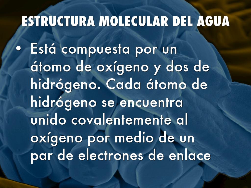 • Está compuesta por un átomo de oxígeno y dos de hidrógeno. Cada átomo de hidrógeno se encuentra unido covalentemente al oxígeno por medio de un par de electrones de enlace