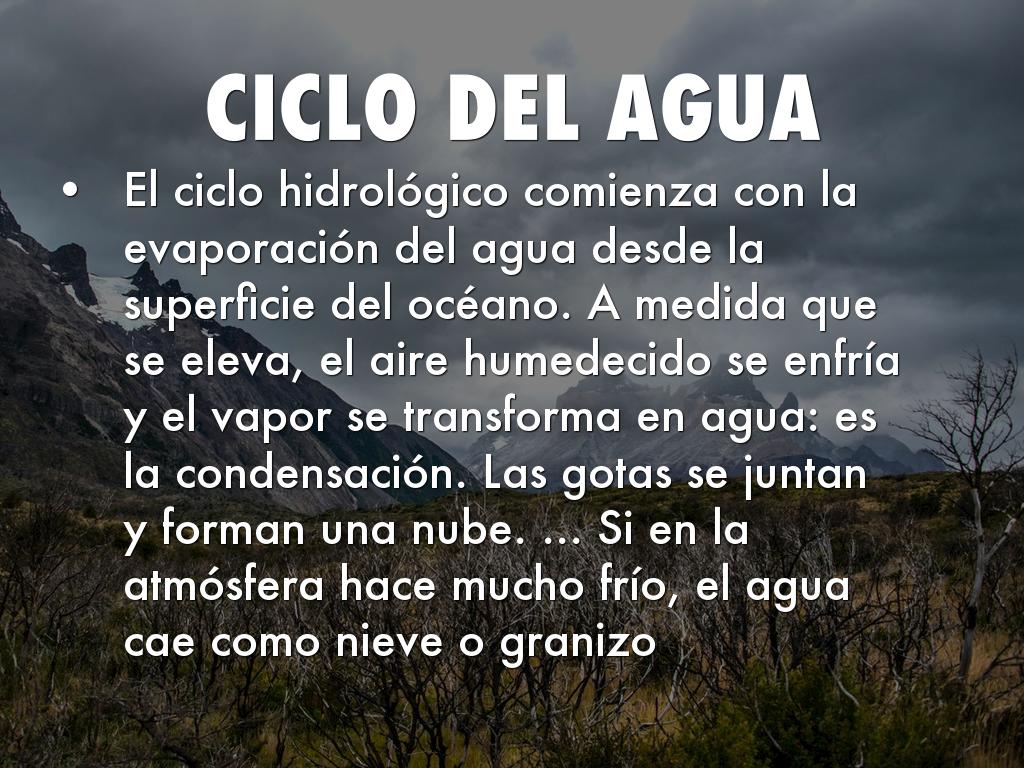• El ciclo hidrológico comienza con la evaporación del agua desde la superficie del océano. A medida que se eleva, el aire humedecido se enfría y el vapor se transforma en agua: es la condensación. Las gotas se juntan y forman una nube. ... Si en la atmósfera hace mucho frío, el agua cae como nieve o granizo