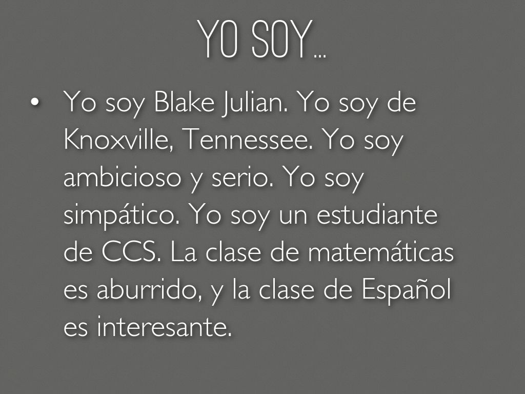 Yo soy Blake Julian. Yo soy de Knoxville, Tennessee. Yo soy ambicioso y serio. Yo soy simpático. Yo soy un estudiante de CCS. La clase de matemáticas es aburrido, y la clase de Español es interesante.
