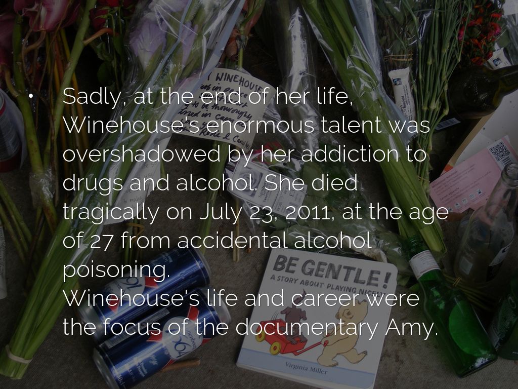 • Sadly, at the end of her life, Winehouse's enormous talent was overshadowed by her addiction to drugs and alcohol. She died tragically on July 23, 2011, at the age of 27 from accidental alcohol poisoning. Winehouse's life and career were the focus of the documentary Amy.