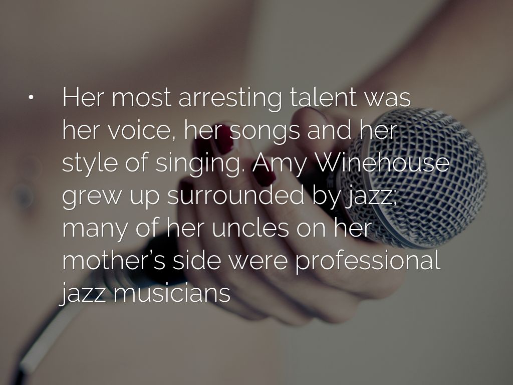 • Her most arresting talent was her voice, her songs and her style of singing. Amy Winehouse grew up surrounded by jazz; many of her uncles on her mother’s side were professional jazz musicians