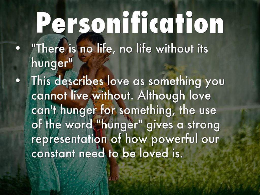 This describes love as something you cannot live without. Although love can't hunger for something, the use of the word "hunger" gives a strong representation of how powerful our constant need to be loved is.