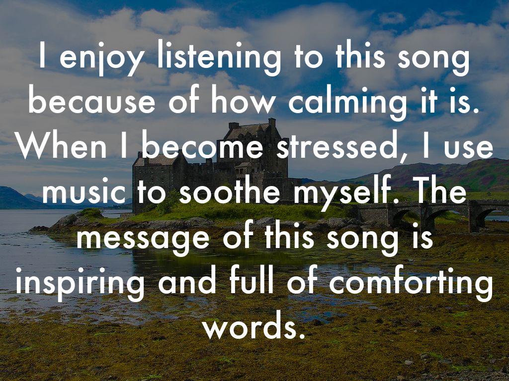 I enjoy listening to this song because of how calming it is. When I become stressed, I use music to soothe myself. The message of this song is inspiring and full of comforting words.