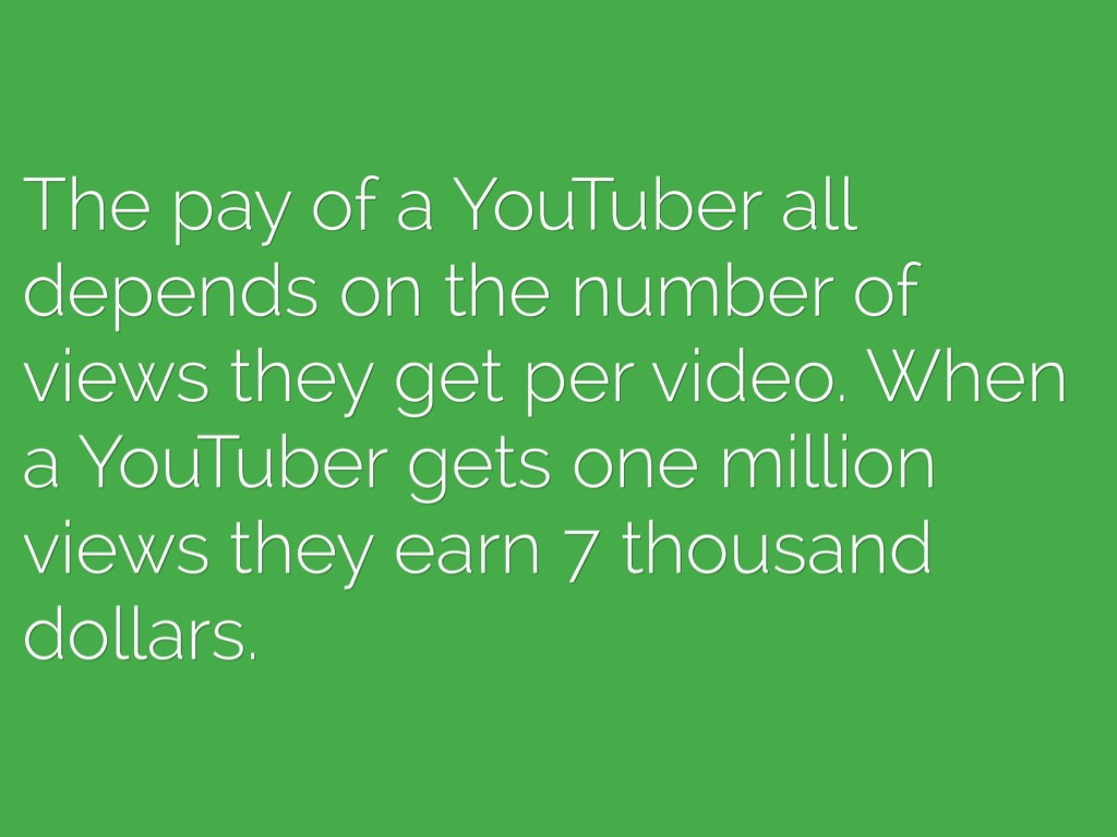 The pay of a YouTuber all depends on the number of views they get per video. When a YouTuber gets one million views they earn 7 thousand dollars.