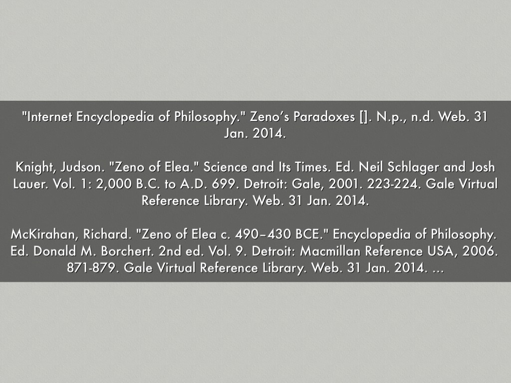 McKirahan, Richard. "Zeno of Elea c. 490–430 BCE." Encyclopedia of Philosophy. Ed. Donald M. Borchert. 2nd ed. Vol. 9. Detroit: Macmillan Reference USA, 2006. 871-879. Gale Virtual Reference Library. Web. 31 Jan. 2014.