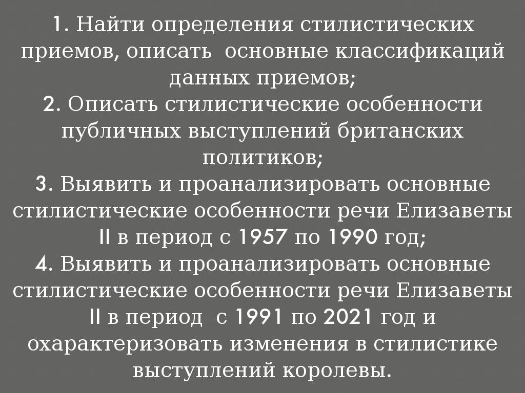 Цель исследования: выявление и анализ стилистических особенностей публичных выступлений Елизаветы II в период с 1957 по 2021