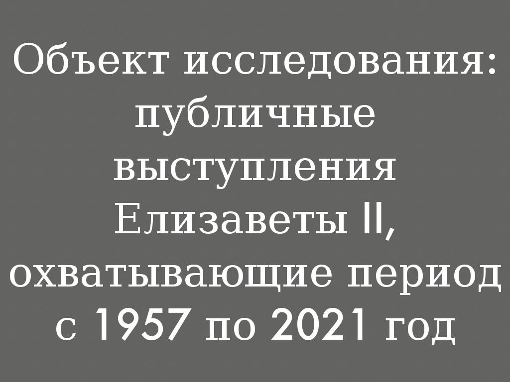 Объект исследования: публичные выступления Елизаветы II, охватывающие период с 1957 по 2021 год