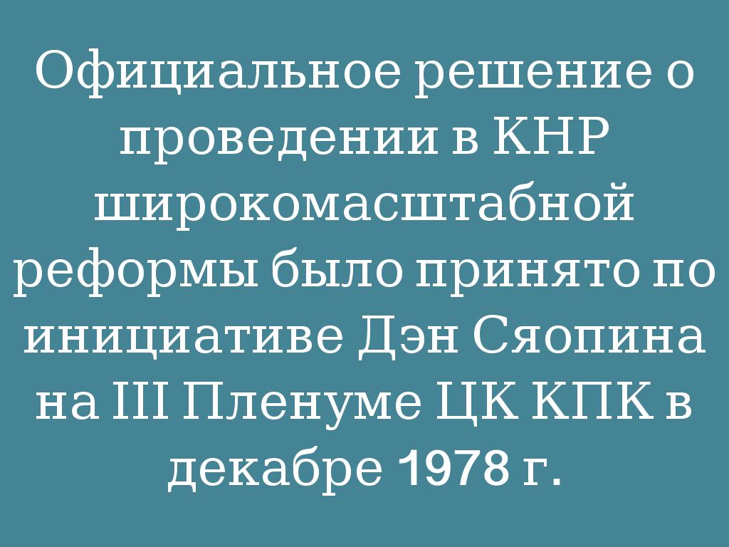 Официальное решение о проведении в КНР широкомасштабной реформы было принято по инициативе Дэн Сяопина на ІІІ Пленуме ЦК КПК в декабре 1978 г.