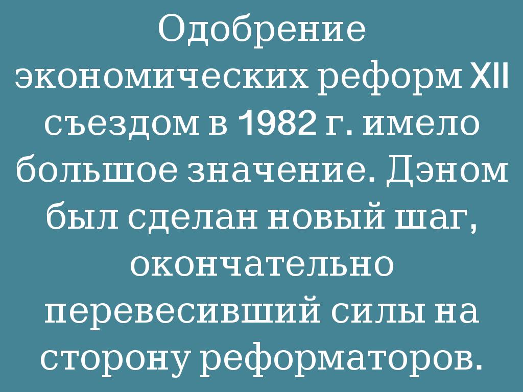Одобрение экономических реформ XII съездом в 1982 г. имело большое значение. Дэном был сделан новый шаг, окончательно перевесивший силы на сторону реформаторов.