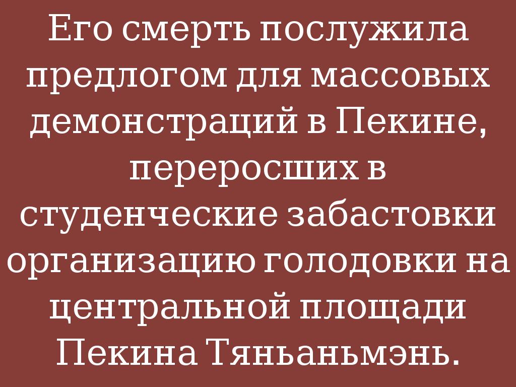 Его смерть послужила предлогом для массовых демонстраций в Пекине, переросших в студенческие забастовки организацию голодовки на центральной площади Пекина Тяньаньмэнь.