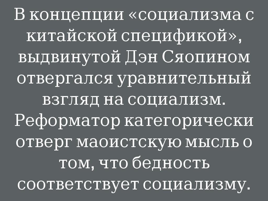 В концепции «социализма с китайской спецификой», выдвинутой Дэн Сяопином отвергался уравнительный взгляд на социализм. Реформатор категорически отверг маоистскую мысль о том, что бедность соответствует социализму.