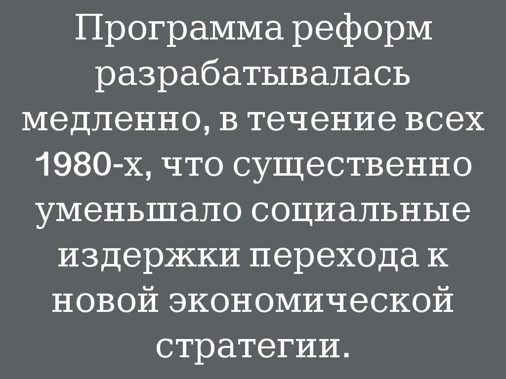 Программа реформ разрабатывалась медленно, в течение всех 1980-х, что существенно уменьшало социальные издержки перехода к новой экономической стратегии.