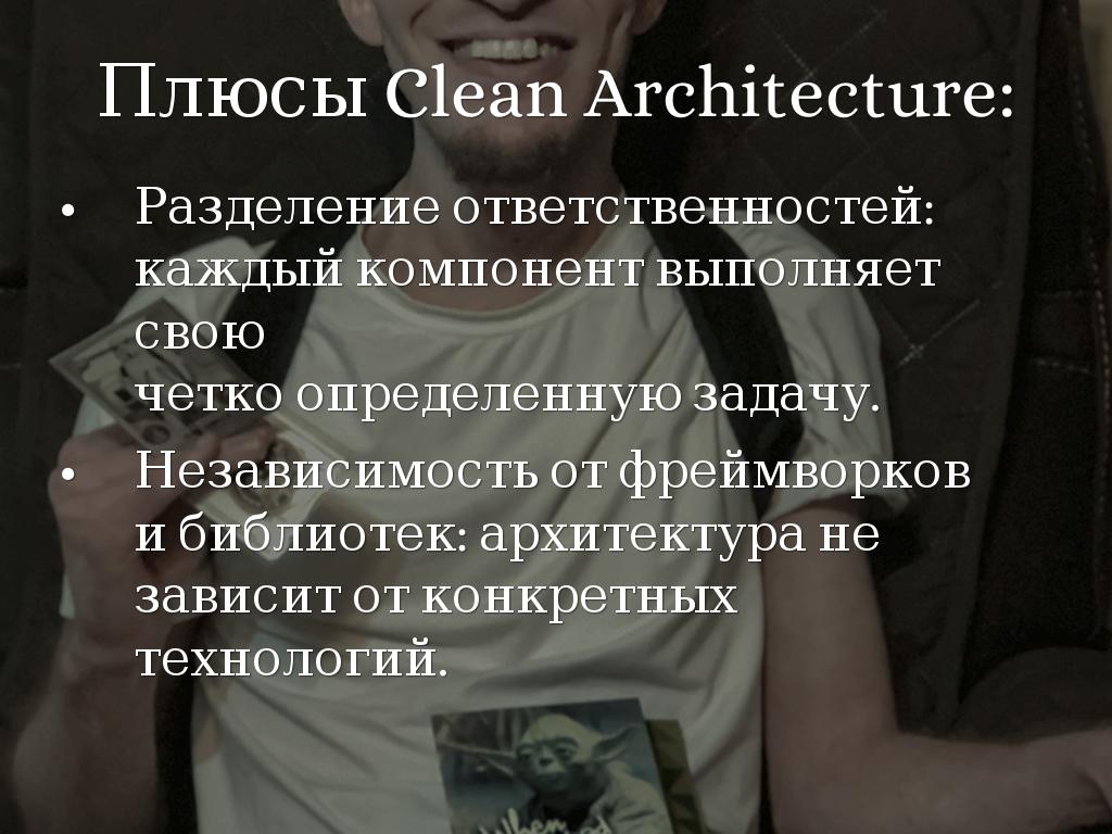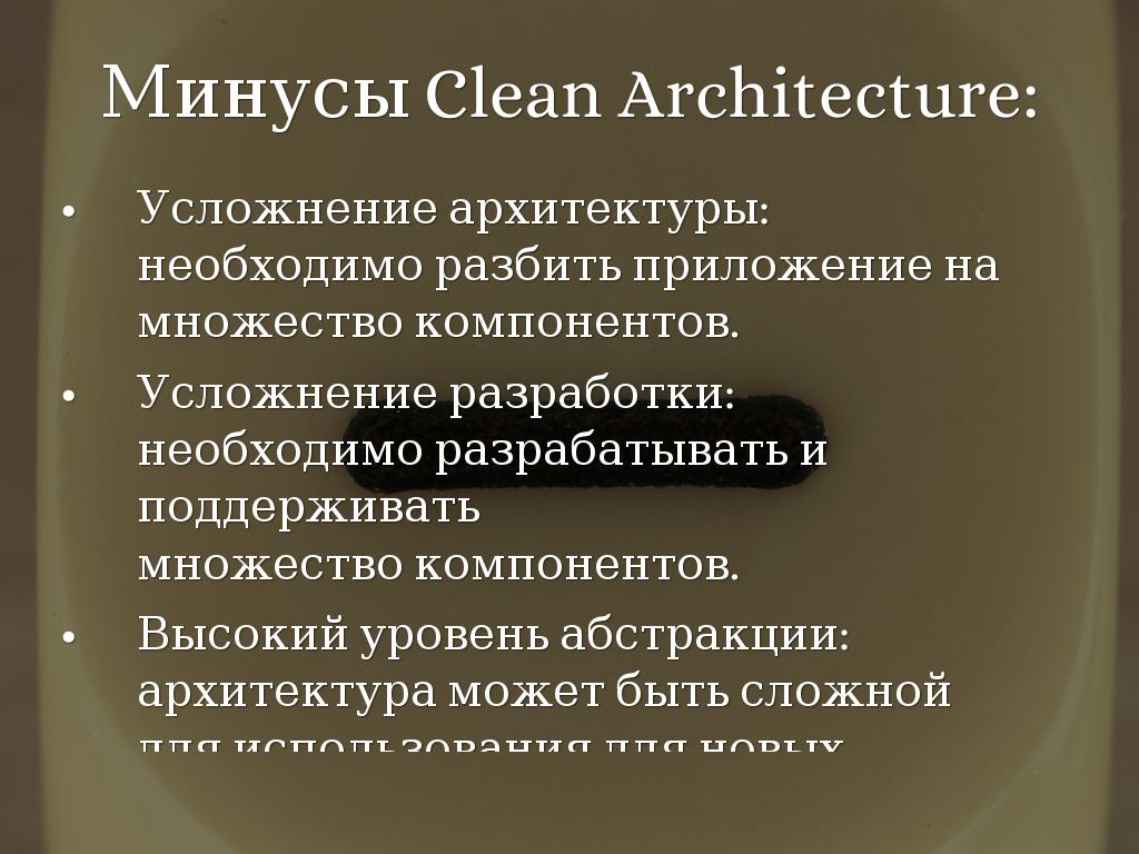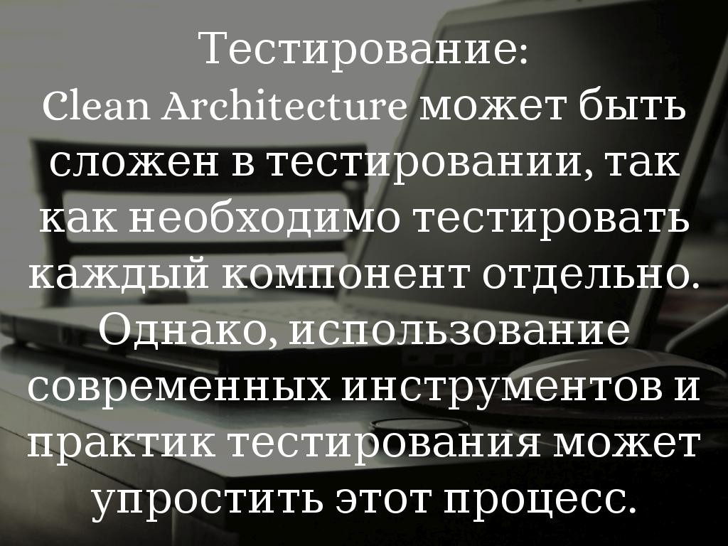 Тестирование: Clean Architecture может быть сложен в тестировании, так как необходимо тестировать каждый компонент отдельно. Однако, использование современных инструментов и практик тестирования может упростить этот процесс.