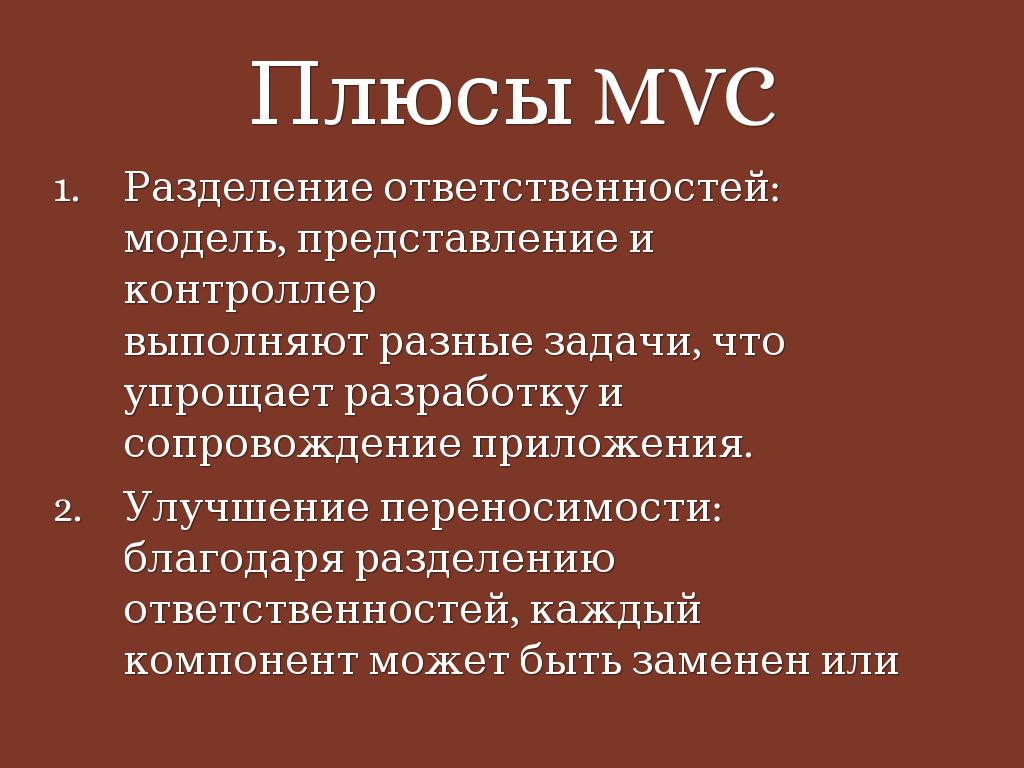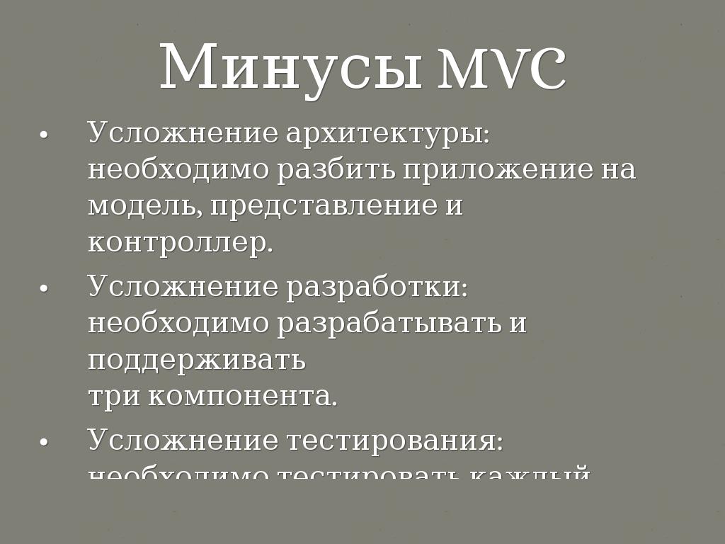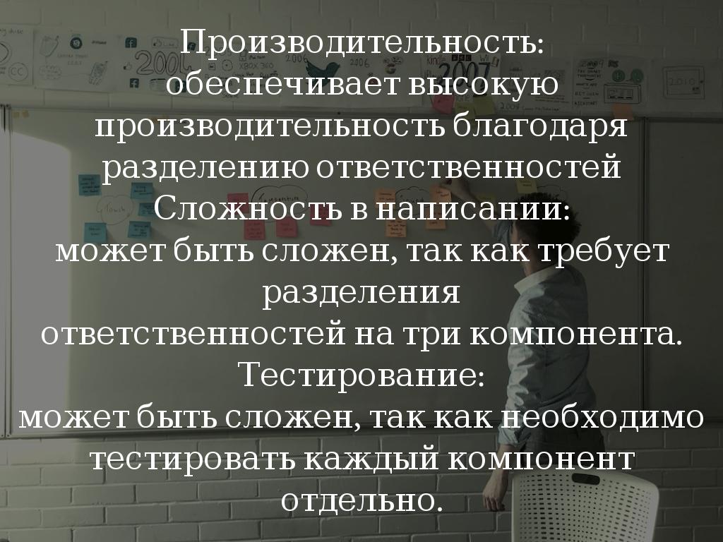 Производительность: обеспечивает высокую производительность благодаря разделению ответственностей Сложность в написании: может быть сложен, так как требует разделения ответственностей на три компонента. Тестирование: может быть сложен, так как необходимо тестировать каждый компонент отдельно.