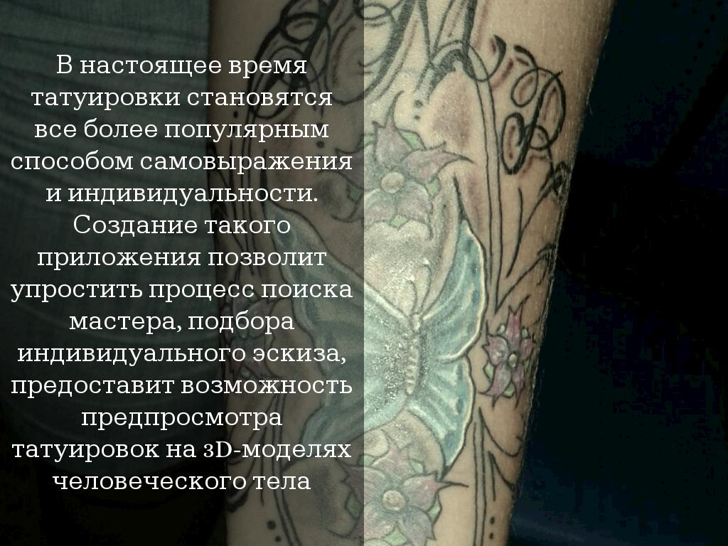 В настоящее время татуировки становятся все более популярным способом самовыражения и индивидуальности. Создание такого приложения позволит упростить процесс поиска мастера, подбора индивидуального эскиза, предоставит возможность предпросмотра татуировок на 3D-моделях человеческого тела