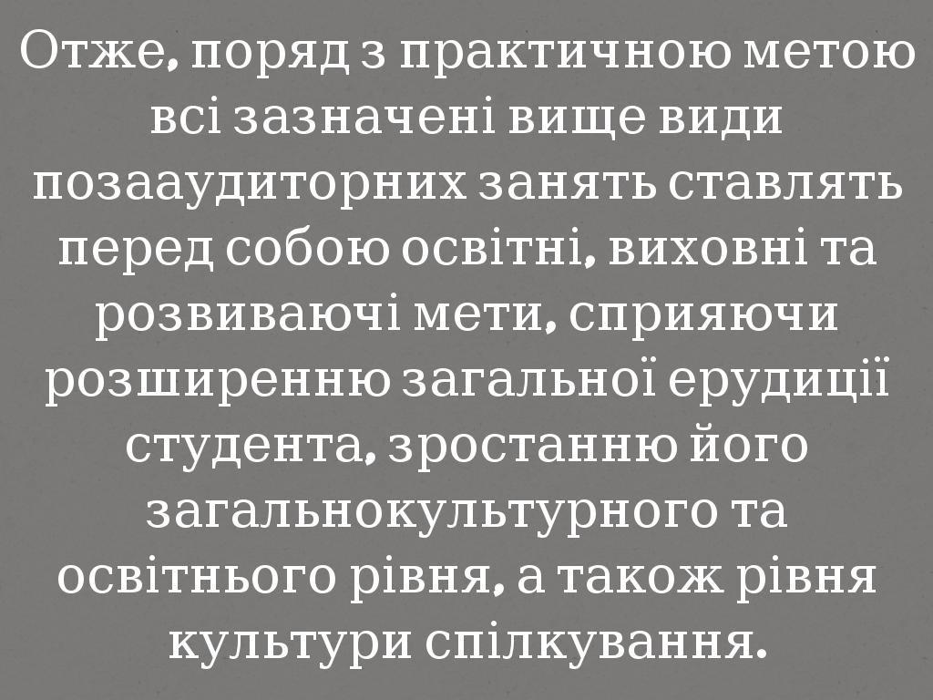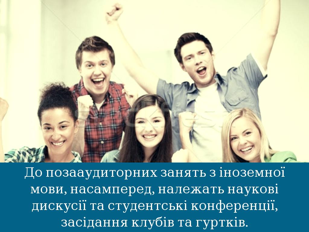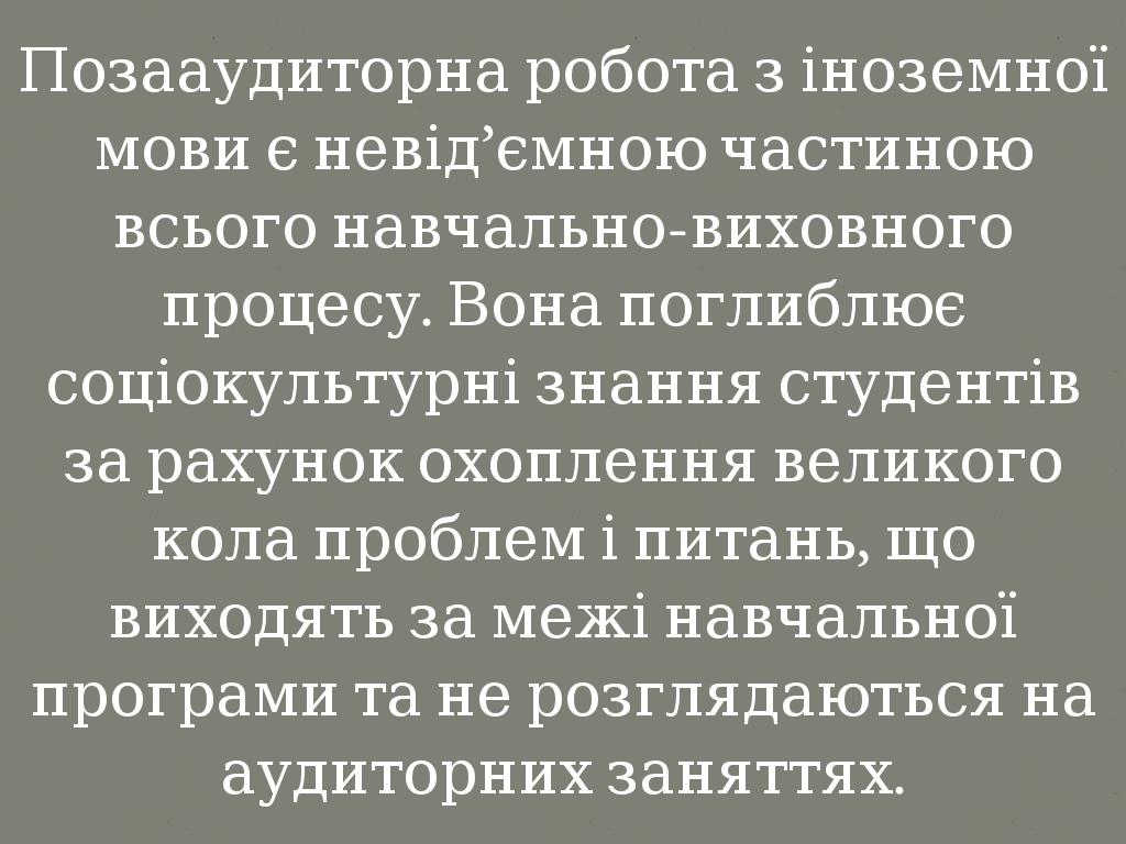 Позааудиторна робота з іноземної мови є невід’ємною частиною всього навчально-виховного процесу. Вона поглиблює соціокультурні знання студентів за рахунок охоплення великого кола проблем і питань, що виходять за межі навчальної програми та не розглядаються на аудиторних заняттях.