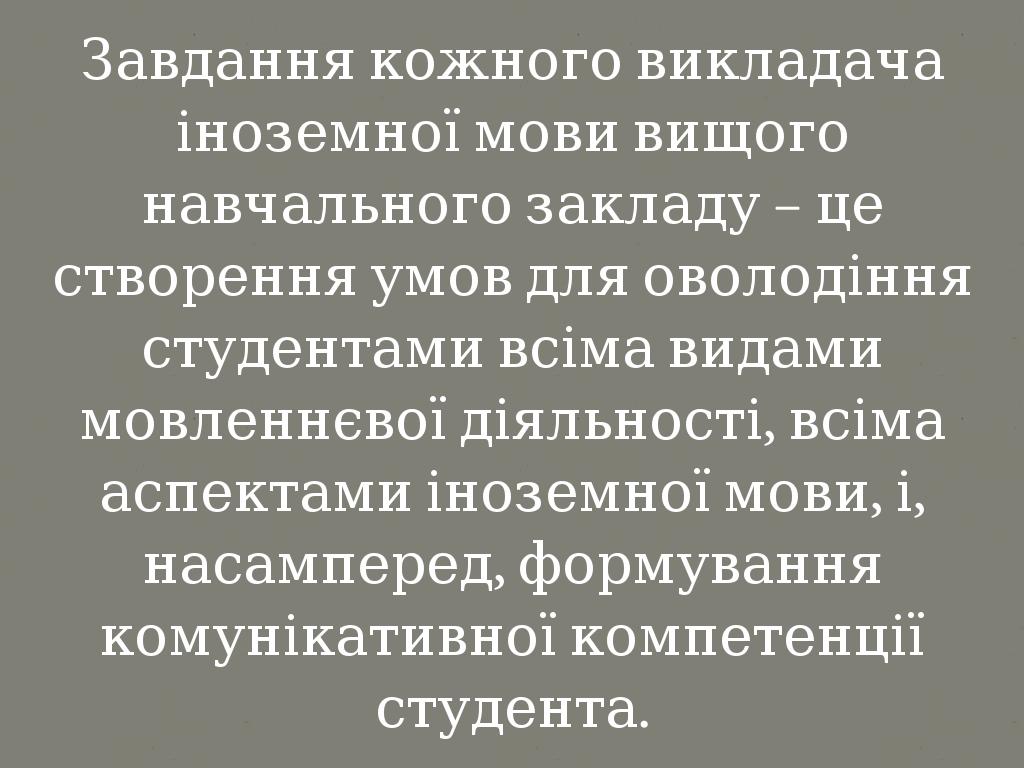Завдання кожного викладача іноземної мови вищого навчального закладу – це створення умов для оволодіння студентами всіма видами мовленнєвої діяльності, всіма аспектами іноземної мови, і, насамперед, формування комунікативної компетенції студента.