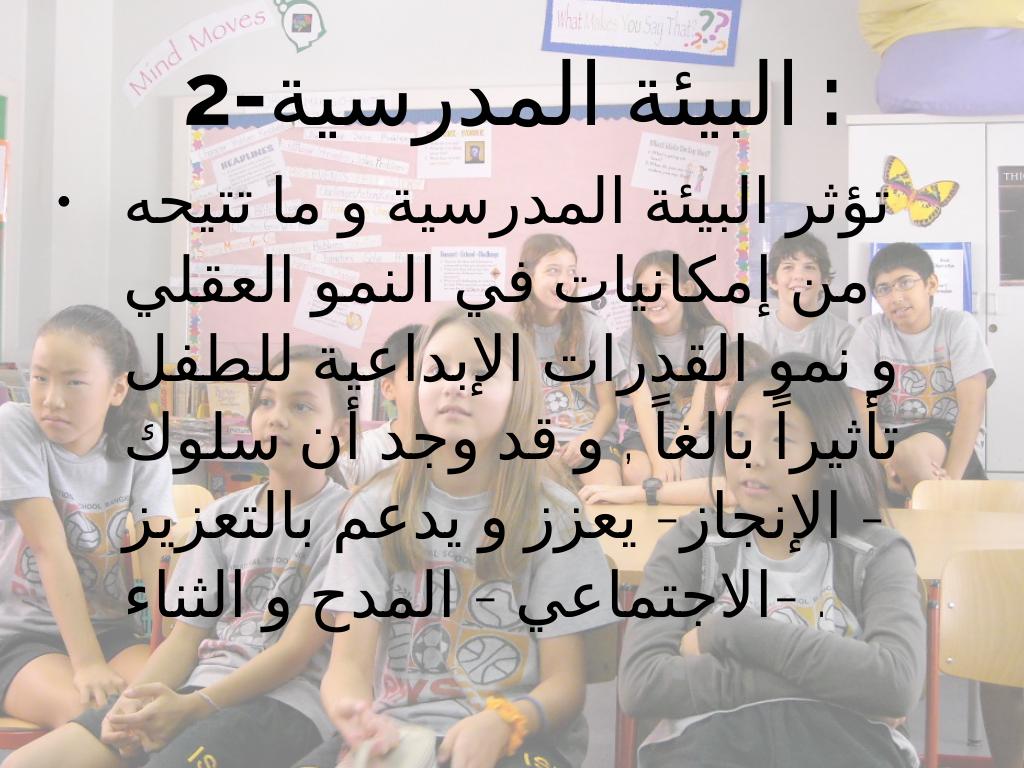 - تؤثر البيئة المدرسية و ما تتيحه من إمكانيات في النمو العقلي و نمو القدرات الإبداعية للطفل تأثيراً بالغاً , و قد وجد أن سلوك - الإنجاز- يعزز و يدعم بالتعزيز الاجتماعي - المدح و الثناء- .