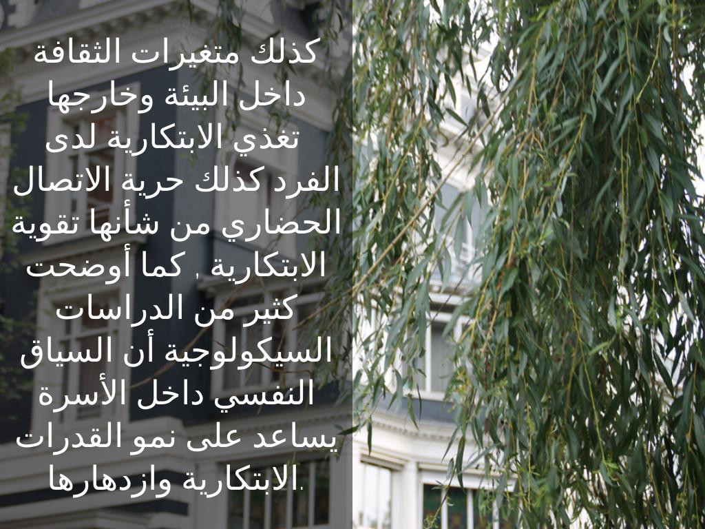 كذلك متغيرات الثقافة داخل البيئة وخارجها تغذي الابتكارية لدى الفرد كذلك حرية الاتصال الحضاري من شأنها تقوية الابتكارية , كما أوضحت كثير من الدراسات السيكولوجية أن السياق النفسي داخل الأسرة يساعد على نمو القدرات الابتكارية وازدهارها.