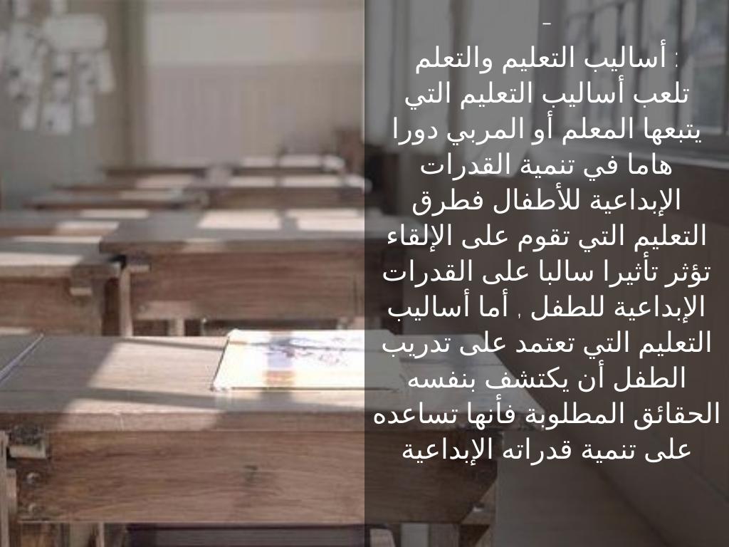 تلعب أساليب التعليم التي يتبعها المعلم أو المربي دورا هاما في تنمية القدرات الإبداعية للأطفال فطرق التعليم التي تقوم على الإلقاء تؤثر تأثيرا سالبا على القدرات الإبداعية للطفل , أما أساليب التعليم التي تعتمد على تدريب الطفل أن يكتشف بنفسه الحقائق المطلوبة فأنها تساعده على تنمية قدراته الإبداعية