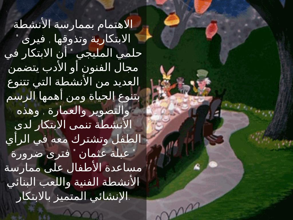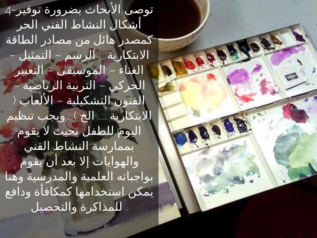 4-توصى الأبحاث بضرورة توفير أشكال النشاط الفني الحر كمصدر هائل من مصادر الطاقة الابتكارية : الرسم – التمثيل – الغناء – الموسيقى – التعبير الحركي – التربية الرياضية – الفنون التشكيلية – الألعاب ( الابتكارية .... الخ ) . ويجب تنظيم اليوم للطفل بحيث لا يقوم بممارسة النشاط الفني والهوايات إلا بعد أن يقوم بواجباته العلمية والمدرسية وهنا يمكن استخدامها كمكافأة ودافع للمذاكرة والتحصيل .