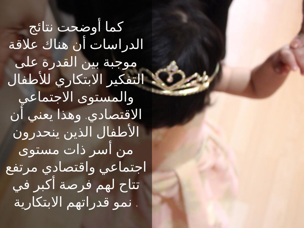 كما أوضحت نتائج الدراسات أن هناك علاقة موجبة بين القدرة على التفكير الابتكاري للأطفال والمستوى الاجتماعي الاقتصادي. وهذا يعني أن الأطفال الذين ينحدرون من أسر ذات مستوى اجتماعي واقتصادي مرتفع تتاح لهم فرصة أكبر في نمو قدراتهم الابتكارية .