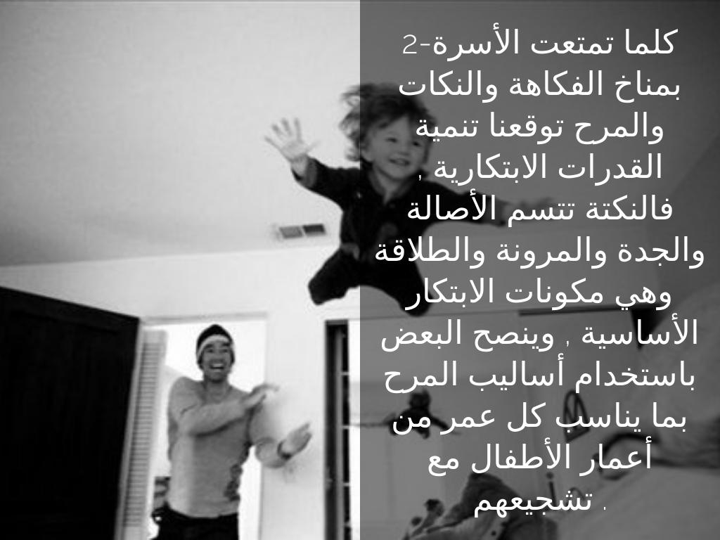 2-كلما تمتعت الأسرة بمناخ الفكاهة والنكات والمرح توقعنا تنمية القدرات الابتكارية , فالنكتة تتسم الأصالة والجدة والمرونة والطلاقة وهي مكونات الابتكار الأساسية , وينصح البعض باستخدام أساليب المرح بما يناسب كل عمر من أعمار الأطفال مع تشجيعهم .