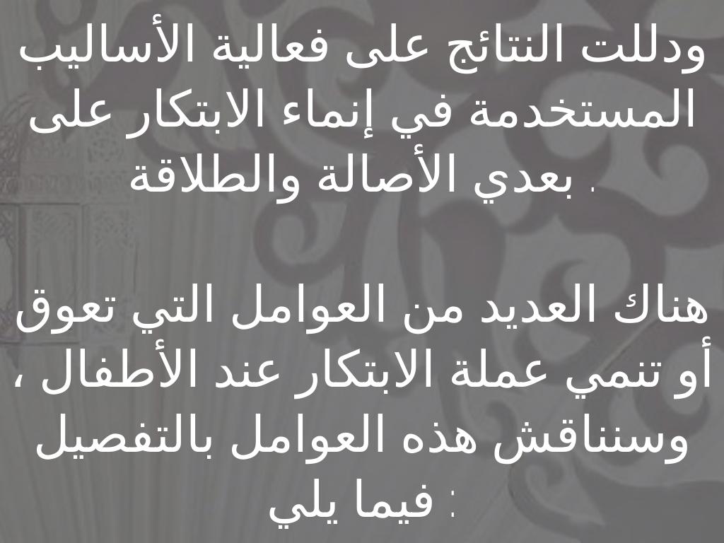 ودللت النتائج على فعالية الأساليب المستخدمة في إنماء الابتكار على بعدي الأصالة والطلاقة .