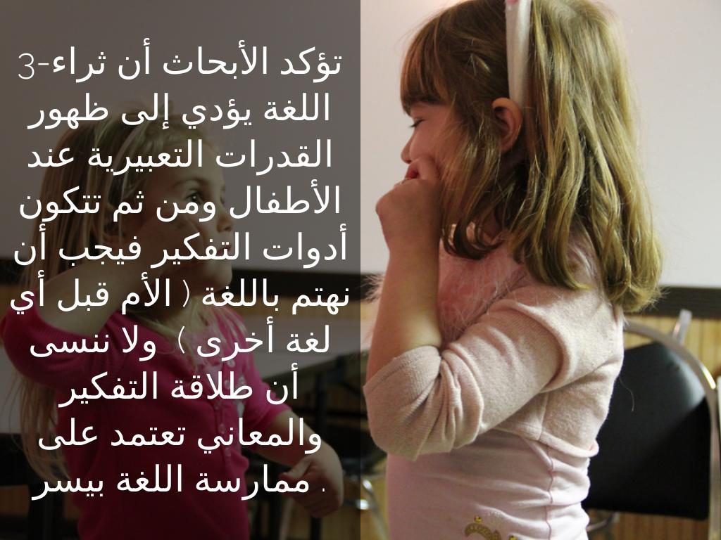 3-تؤكد الأبحاث أن ثراء اللغة يؤدي إلى ظهور القدرات التعبيرية عند الأطفال ومن ثم تتكون أدوات التفكير فيجب أن نهتم باللغة ( الأم قبل أي لغة أخرى ) ولا ننسى أن طلاقة التفكير والمعاني تعتمد على ممارسة اللغة بيسر .