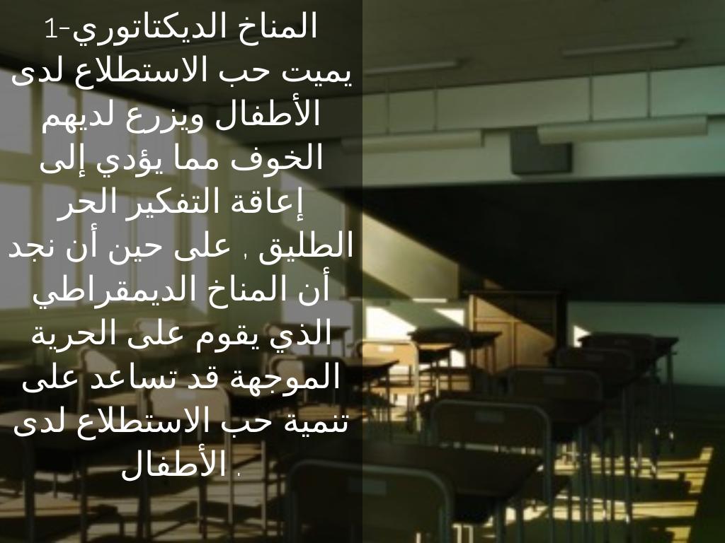1-المناخ الديكتاتوري يميت حب الاستطلاع لدى الأطفال ويزرع لديهم الخوف مما يؤدي إلى إعاقة التفكير الحر الطليق , على حين أن نجد أن المناخ الديمقراطي الذي يقوم على الحرية الموجهة قد تساعد على تنمية حب الاستطلاع لدى الأطفال .