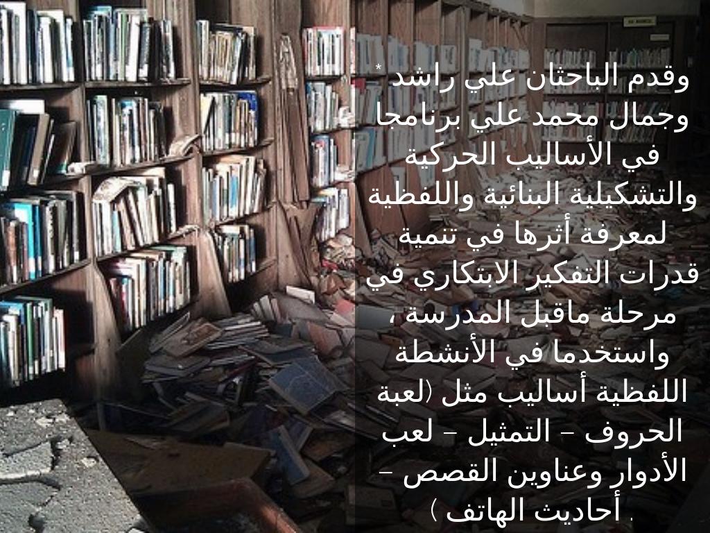* وقدم الباحثان علي راشد وجمال محمد علي برنامجا في الأساليب الحركية والتشكيلية البنائية واللفظية لمعرفة أثرها في تنمية قدرات التفكير الابتكاري في مرحلة ماقبل المدرسة ، واستخدما في الأنشطة اللفظية أساليب مثل (لعبة الحروف – التمثيل – لعب الأدوار وعناوين القصص – أحاديث الهاتف ) .