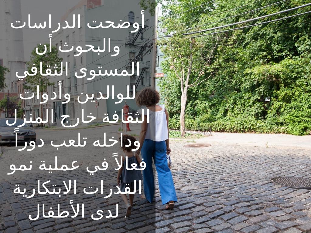 أوضحت الدراسات والبحوث أن المستوى الثقافي للوالدين وأدوات الثقافة خارج المنزل وداخله تلعب دوراً فعالاً في عملية نمو القدرات الابتكارية لدى الأطفال .