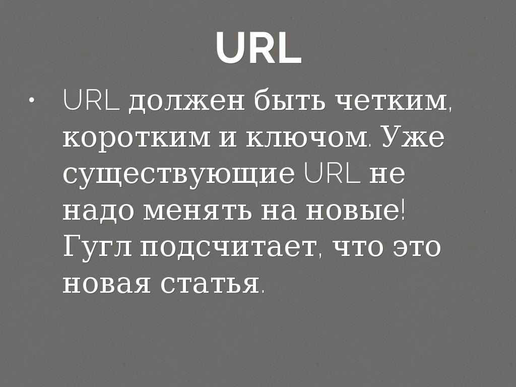 • URL должен быть четким, коротким и ключом. Уже существующие URL не надо менять на новые! Гугл подсчитает, что это новая статья.