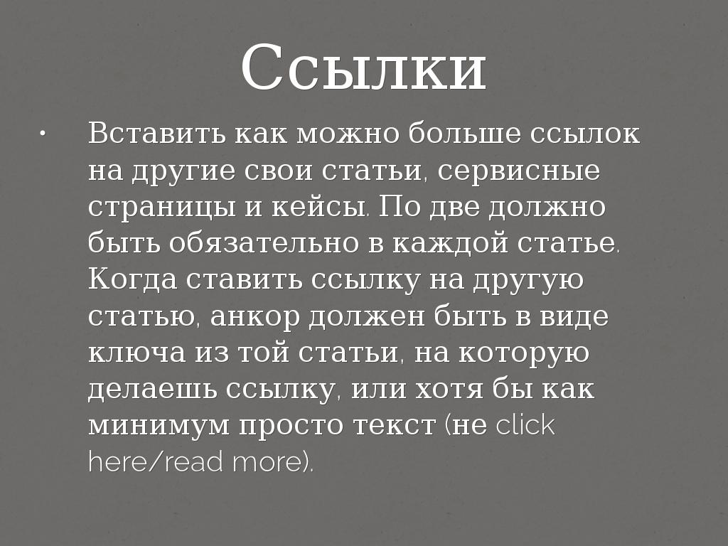 • Вставить как можно больше ссылок на другие свои статьи, сервисные страницы и кейсы. По две должно быть обязательно в каждой статье. Когда ставить ссылку на другую статью, анкор должен быть в виде ключа из той статьи, на которую делаешь ссылку, или хотя бы как минимум просто текст (не click here/read more). Вставить одну ссылку на надежный внешний источник с хорошим DR. Чтобы она открывалась в новом окне, вставляем в тег вот это: target="_blank"